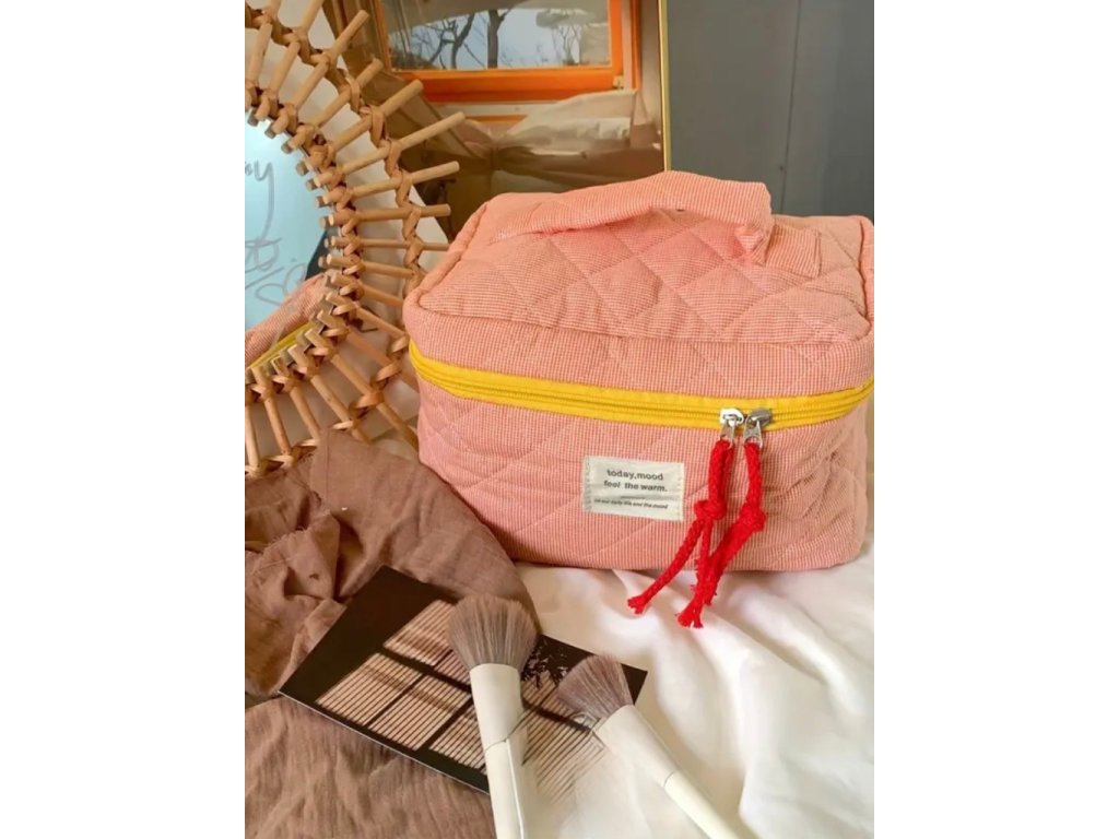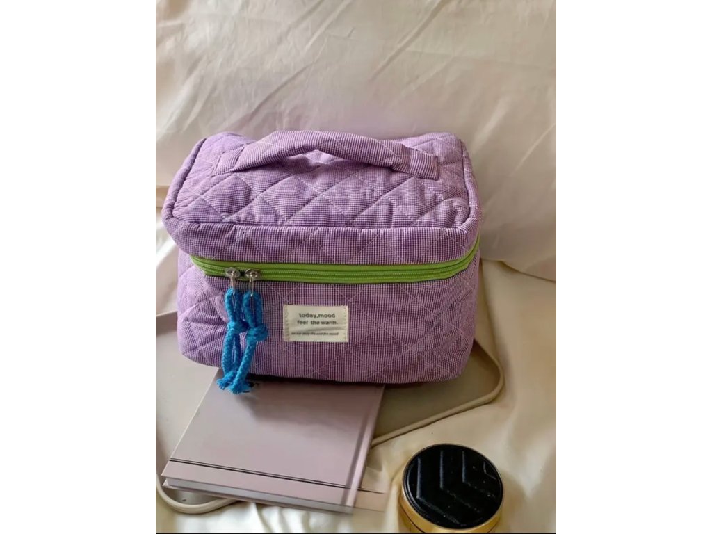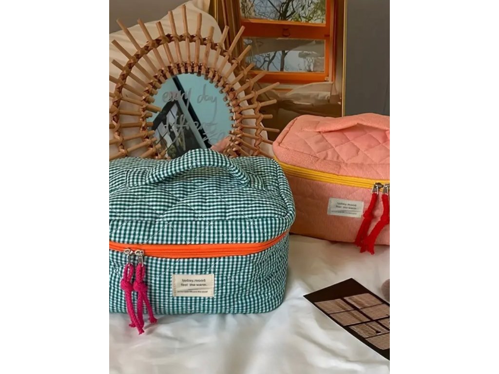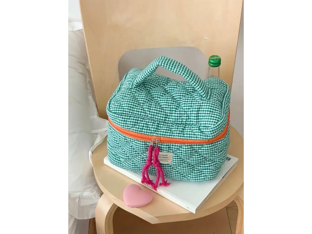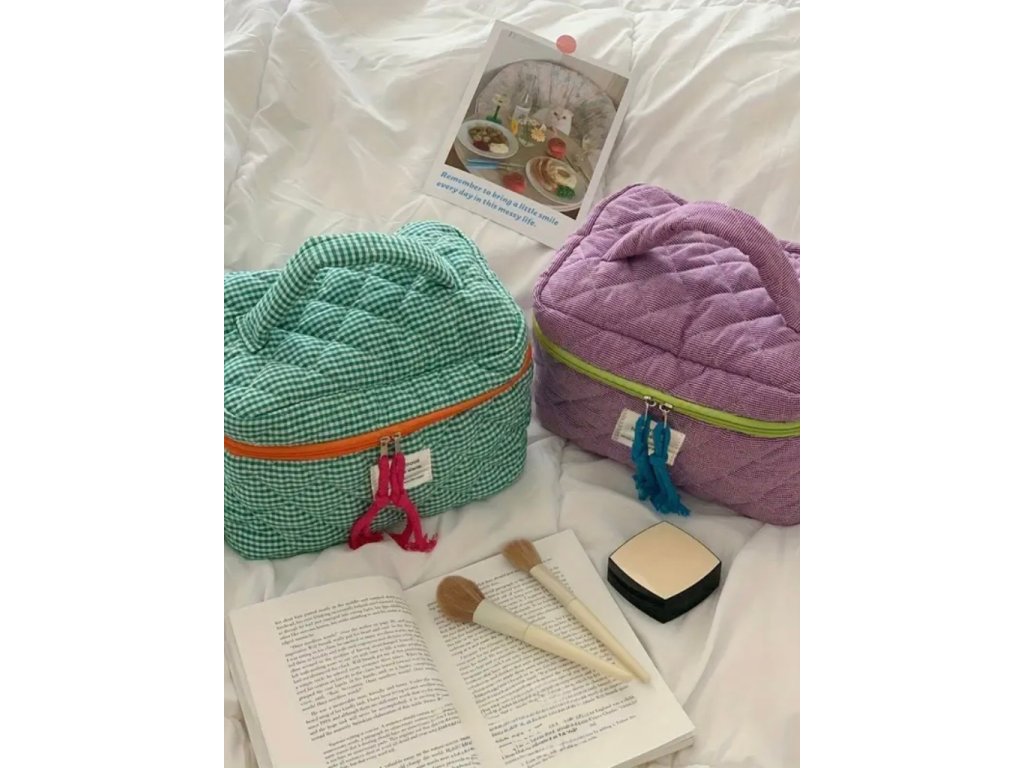 Kosmetická taštička z jemně prošívané látky o rozměrech 25 × 16 cm se skvěle hodí pro ty, kdo chtějí mít v kosmetice přehled, ať už doma nebo na cestách. Je dostatečně prostorná na skincare i dekorativku, a přesto si udrží styl a příjemně kompaktní tvar.
