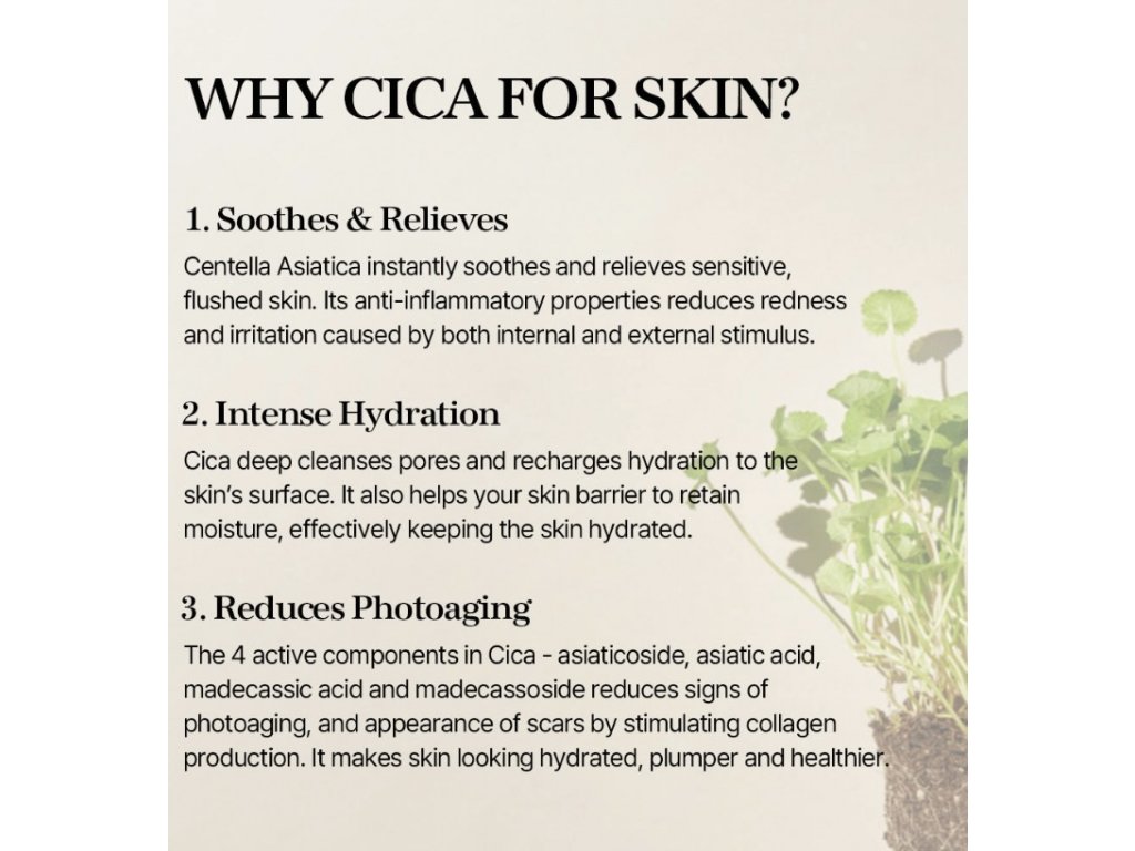 Hlavní ingrediencí v přípravku je centella asiatica (pupečník asijský), který je často označován za zázrak korejské kosmetiky, protože umí pleť zklidňovat, zmírnit zarudnutí a snížit reaktivitu pokožky.